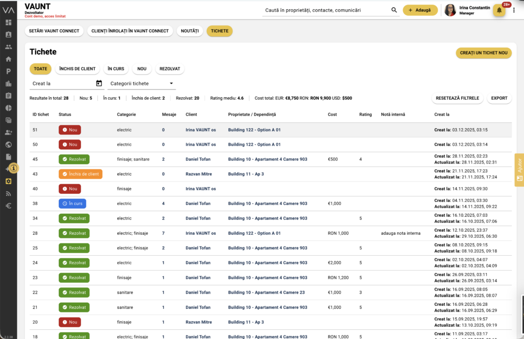 Problemele sunt rezolvate înainte să devină publice. Clienții pot deschide tichete și lăsa testimoniale.